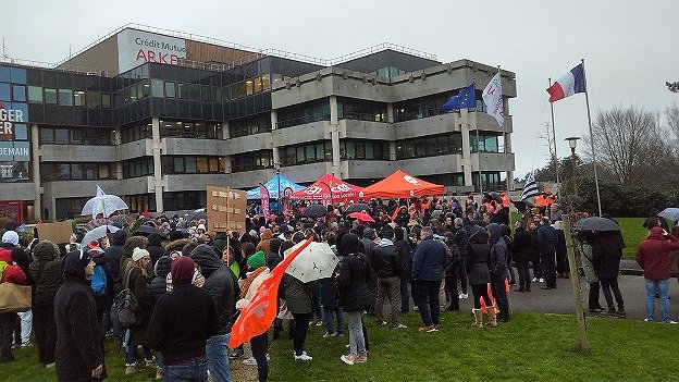 Plus de 200 grévistes se sont rassemblés devant le siège du groupe près de Brest : ils réclament, entre autres, une augmentation de salaire de 500 euros pour tous.