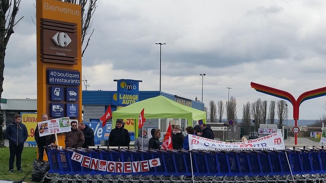 Samedi 31 mars, plus de la moitié des travailleurs du magasin Carrefour de Compiègne était en grève, et les accès au parking étaient bloqués par des piquets.