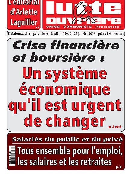 Le système économique américain est malade. Celui des autres grandes puissances industrielles ne va guère mieux. Les cours des Bourses dégringolent. New York a reculé de 8,8 % depuis le début de l'année, Paris de 9,3 %, avant de perdre encore 5 % le 21 janvier à la mi-journée. Et malheureusement cela ne concerne pas que les actionnaires, qui ont accumulé suffisamment de profits au cours des années passées pour voir venir. Cela concerne aussi l'ensemble de la population laborieuse, car la récession économique qui s'annonce risque de signifier un nouveau recul du pouvoir d'achat, de nouvelles suppressions d'emplois et donc une aggravation du chômage. Si l'optimisme est de commande parmi les gens qui nous gouvernent, bien des hommes politiques et des économistes n'écartent pas la perspective d'une crise économique grave, comparable à celle qui avait frappé le monde capitaliste en 1929, et qui l'avait précipité vers la Deuxième Guerre mondiale.