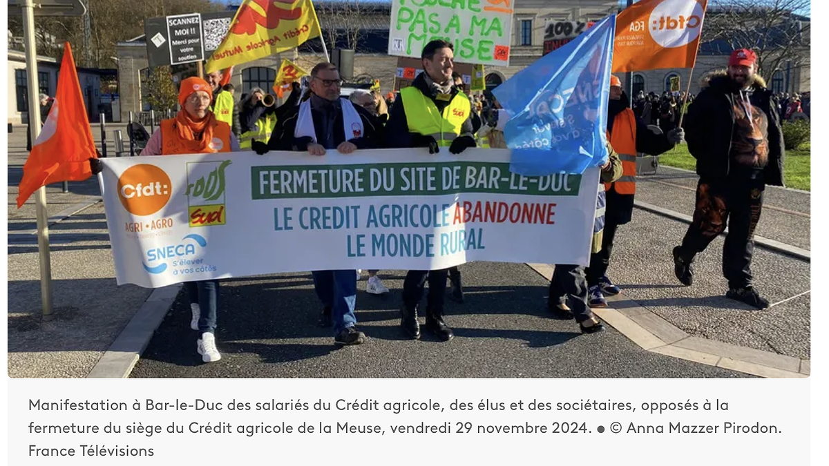 350 personnes ont manifesté vendredi 29 novembre devant la gare de Bar-le-Duc pour protester contre la fermeture du Crédit agricole. 76 emplois seraient ainsi supprimés à Bar-Le-Duc, dans la Meuse un département dévasté par les annonces de licenciements.